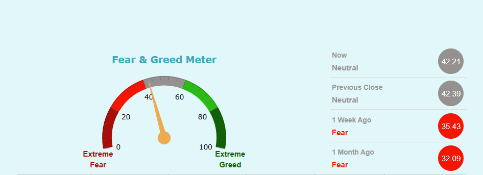 फियर एण्ड ग्रीड मिटरमा फाइनान्स अहिले फियर जोनबाट न्यूट्रल जोनमा पुगेको छ। यसले बजारमा लगानीकर्ताहरुमाझ फाइनान्सको शेयरमूल्य घट्छ भन्ने डर हटेको संकेत गर्दछ।