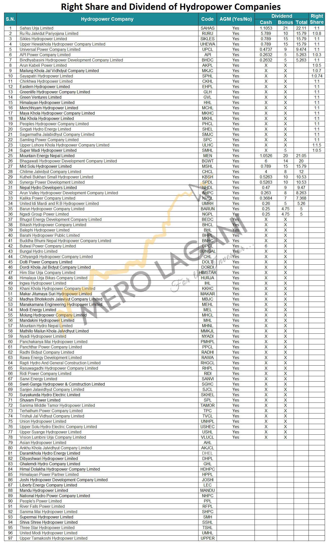 हकप्रद निष्काशनको प्रस्ताव गर्ने हाइड्रोपावर : २४ वटा लाभांश दिने हाइड्रोपावर कम्पनी:१८ वटा साधारण सभा आह्वान गर्ने हाइड्रोपावर:७८ वटा साधारण सभा नगर्ने हाइड्रोपावर: १९ वटा लाभांशसँगै हकप्रद शेयर निष्काशन गर्ने हाइड्रोपावर कम्पनी: ७ वटा |