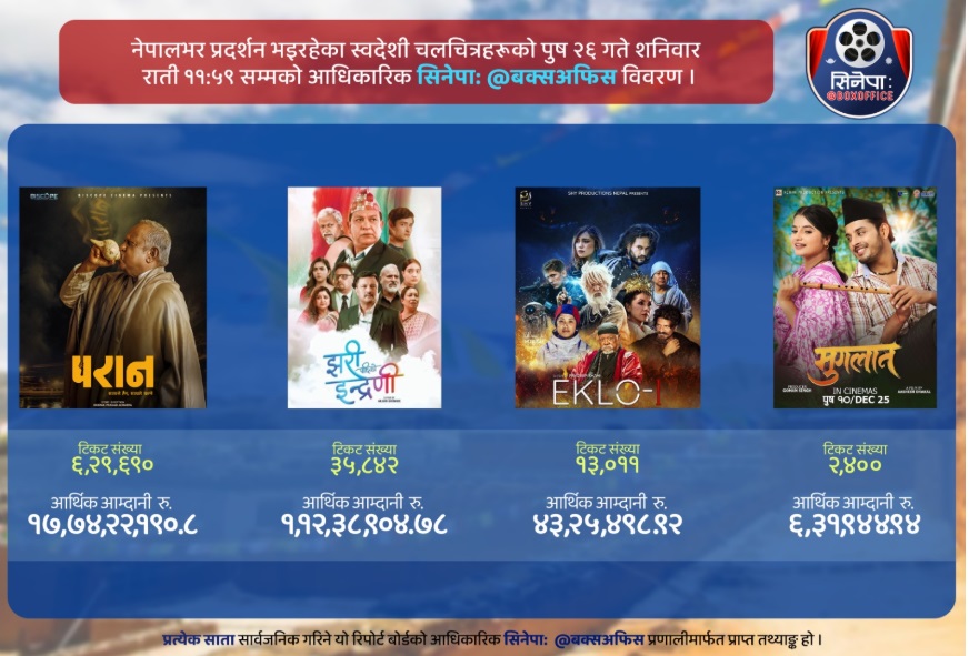 बोर्डका अनुसार हाल नेपालभर प्रदर्शनरत चार चलचित्र परान, झरी पछिको इन्द्रेणी, एक्लो र मुगलानको कारोबार विवरण सार्वजनिक गरिएको हो।