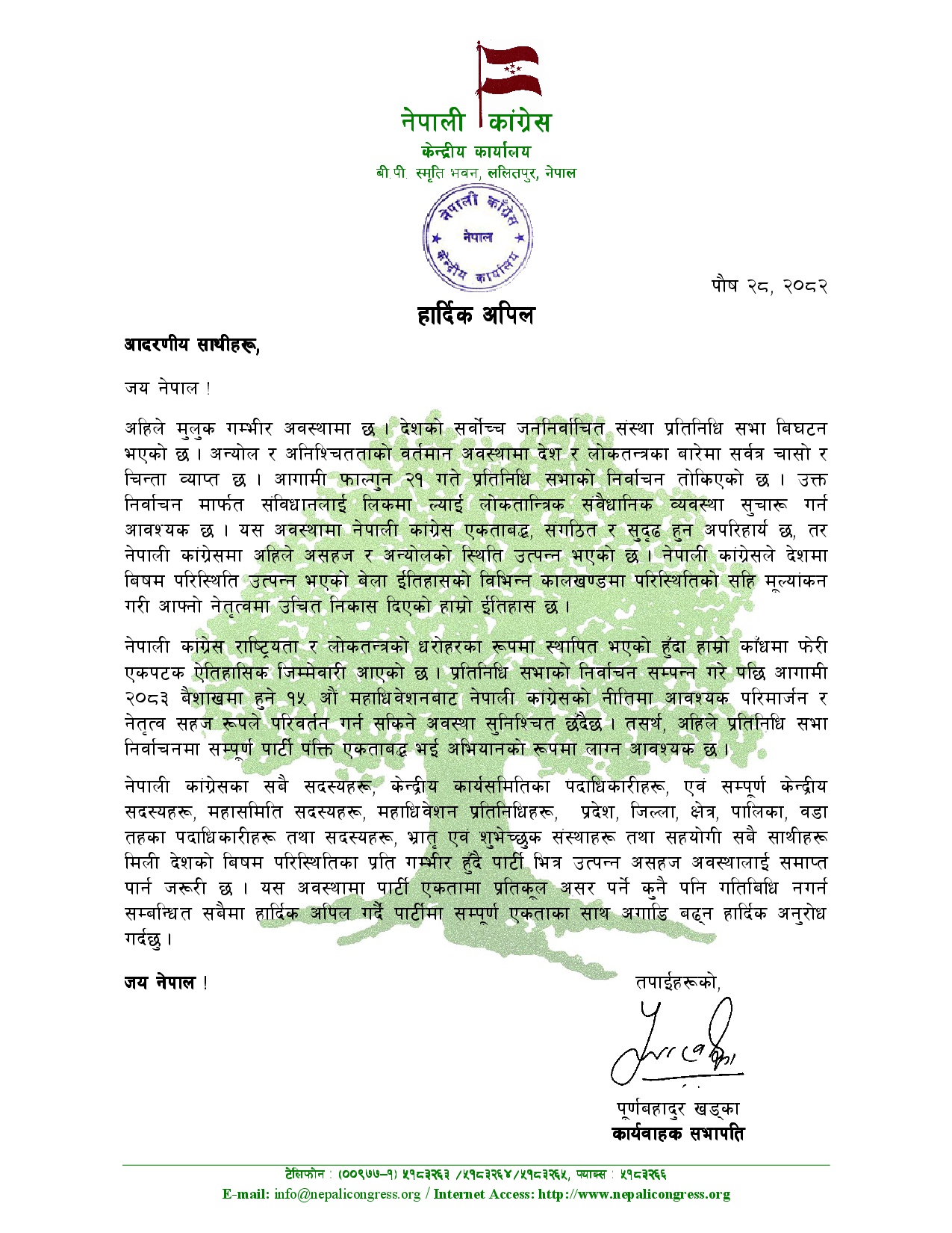 "प्रतिनिधिसभाको निर्वाचन सम्पन्न गरेपछि आगामी २०८३ वैशाखमा हुने १५औँ महाधिवेशनबाट नेपाली कांग्रेसको नीतिमा आवश्यक परिमार्जन र नेतृत्व सहज रूपले परिवर्तन गर्न सकिने अवस्था सुनिश्चित छँदै छ," खड्काले भनेका छन्, "तसर्थ, अहिले प्रतिनिधिसभा निर्वाचनमा सम्पूर्ण पार्टी पंक्ति एकताबद्ध भई अभियानको रूपमा लाग्न आवश्यक छ ।"