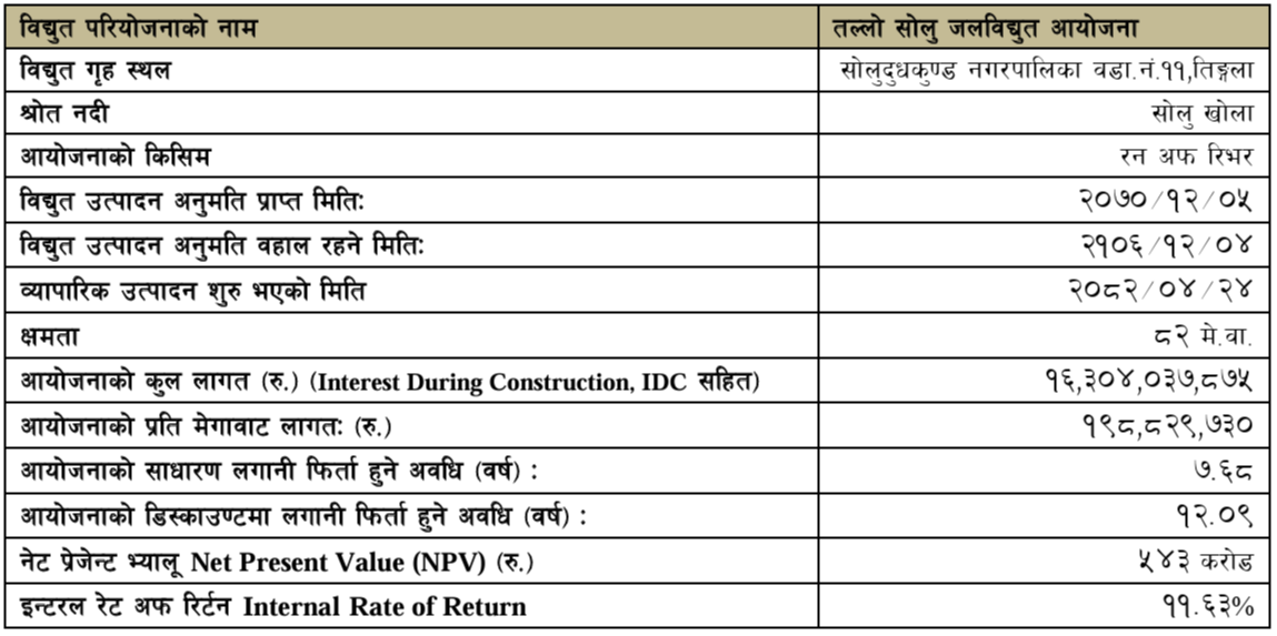 सो आयोजनाको कुल लागत १६ अर्ब ३० करोड ४० लाख रुपैयाँ रहेको छ भने प्रतिमेगावाट लागत १९ करोड ८८ लाख रुपैयाँ रहेको छ। आयोजनाको साधारण लगानी फिर्ता हुने अवधि ७.६८ वर्ष रहेको छ भने डिस्काउण्टमा लगानी फिर्ता हुने अवधि १२.०९ वर्ष रहेको छ। कम्पनीले २०८२ साउन २४ गतेदेखि व्यापारिक उत्पादन गरिरहेको छ।