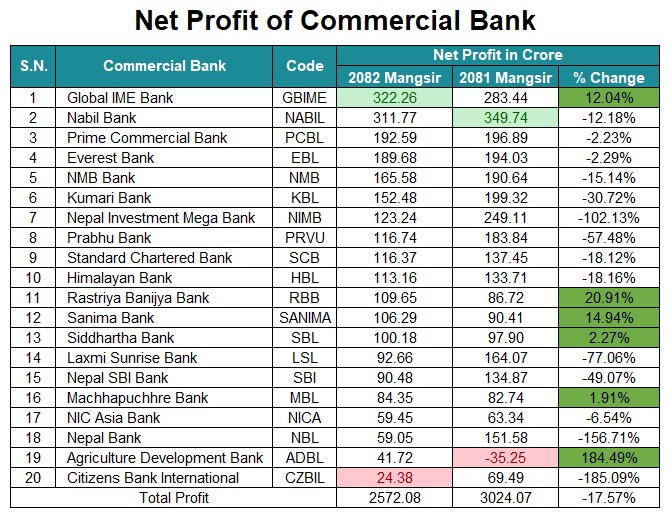 कृषि विकास बैक गत वर्ष मंसिरसम्म ३५ करोड २५ लाख रुपैयाँ नोक्सानीमा रहेकोमा चालु आवको मंसिरसम्म आउँदा ४१ करोड ७२ लाख रुपैयाँ नाफामा छ । राष्ट्रिय वाणिज्य बैंककाे गत वर्षको मंसिरमा ८६ करोड ७२ लाख रुपैयाँ खुद मुनाफा गरेकोमा चालु आवको मंसिरसम्म आइपुग्दा २०.९१ प्रतिशतले वृद्धि भई १ अर्ब ९ करोड ६७ लाख रुपैयाँ पुगेको छ । त्यस्तै सानिमा बैंककाे ९० करोड ४१ लाख रुपयाँ खुद मुनाफा गरेकोमा चालु आवको मंसिरसम्ममा १ अर्ब ६ करोड २९ लाख रुपैयाँ खुद मुनाफा पुगेको छ । ग्लोबल आईएमई बैंकले १२.०४ प्रतिशतले नाफा वृद्धि गरेर ३ अर्ब २२ करोड २६ लाख रुपैयाँ पुर्याउँदा सिद्धार्थले १ अर्ब र माछापुच्छ् बैंकले ८४ करोड ३५ लाख रुपैयाँ खुद मुनाफा गरेका छन् ।
