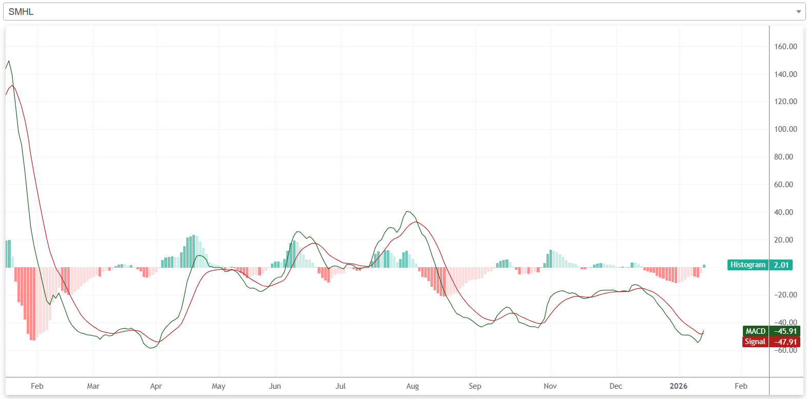 यस साता कम्पनीको शेयरमूल्यले बुलिश क्रशओभर बनाएको छ। साताको अन्तिम कारोबार दिन कम्पनीको एमएसिडी रेखाले सिग्नल रेखालाई तलबाट काटेर माथि लागेसँगै यस्तो क्रशओभर बनेको हो। यसले आगामी दिनमा कम्पनीको शेयरमूल्य बढ्ने संकेत गर्दछ। यद्यपि, सुनिश्चित गर्न भने आगामी साताको पहिलो कारोबार दिनको कारोबार हेर्नुपर्नेछ। कम्पनीको हिस्टोग्राम पनि नकारात्मक क्षेत्रबाट सकारात्मक क्षेत्रमा पुगेको छ।