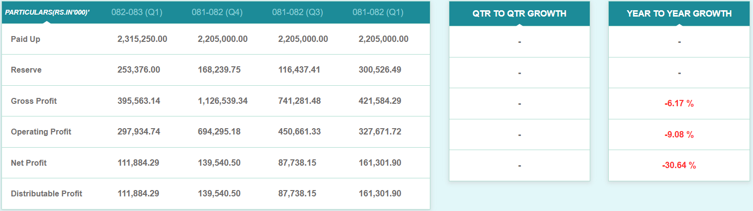 समीक्षा अवधिमा कम्पनीको विद्युत बिक्रीबाट हुने आम्दानी ४२ करोड १५ लाख रुपैयाँबाट घटेर ३९ करोड ५५ लाख रुपैयाँमा झरेको छ। कम्पनीको विद्युत बिक्री आम्दानी घट्दा नाफामा गिरावट आएको हो। समीक्षा अवधिमा कम्पनीको वित्तीय खर्च १६ करोड ३५ लाख रुपैयाँबाट घटेर १८ करोड ६० लाख रुपैयाँमा सीमित भएको छ।