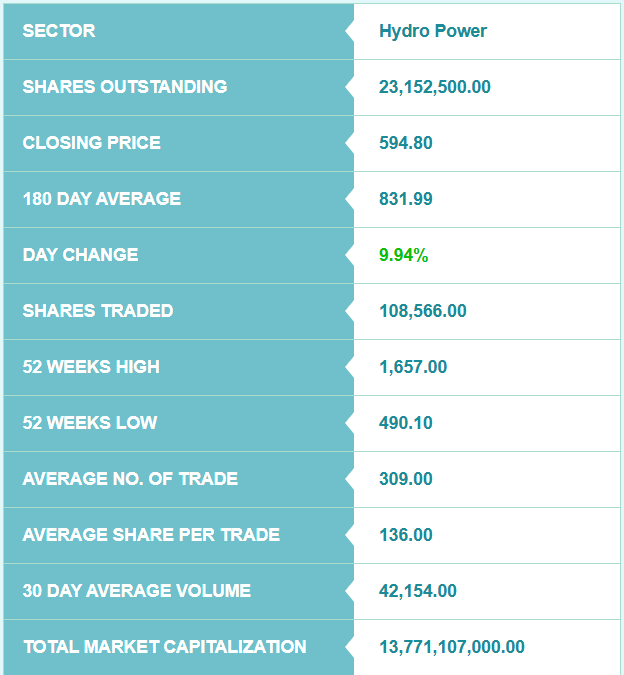 हाल नेप्सेमा कम्पनीको २ करोड ३१ लाख ५२ हजार ५०० कित्ता शेयर सूचीकृत छ। साताको अन्तिम कारोबार मूल्यका आधारमा कम्पनीको कुल बजार पूँजीकरण १३ अर्ब ७७ करोड ११ लाख ७ हजार रुपैयाँ रहेको छ। कम्पनीको १८० दिने औषत मूल्य ८३१ रुपैयाँ ९९ पैसा रहेको छ। त्यसैगरी, कम्पनीको ५२ हप्ताको उच्च मूल्य १ हजार ६५७ रुपैयाँ रहेको छ भने न्यून मूल्य ४९० रुपैयाँ १० पैसा रहेको छ।