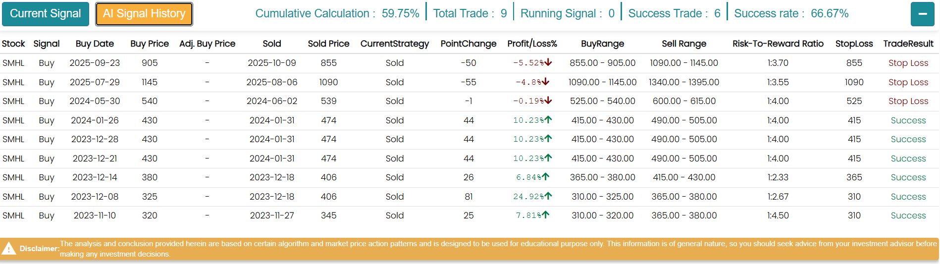 मेरोलगानी एआई चार्टले कम्पनीको शेयरमा हालसम्म ९ वटा सिग्नल दिइसकेको छ। जसमध्ये ६ सिग्नलमा लगानीकर्ताहरुले नाफा कमाएका थिए भने तीन सिग्नलमा स्टप लस गर्नु परेको थियो। हाल एआईले कम्पनीको शेयरमा कुनै सिग्नल दिएको छैन।