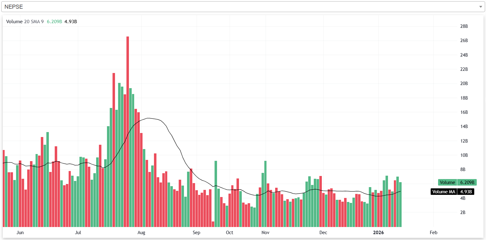 गत साता नेप्सेको भोल्यूम बलियो रहेको छ। गत साता नेप्सेमा दैनिक औषतमा ६ अर्ब ५५ करोडको शेयर कारोबार भएको थियो। साताको अन्तिम कारोबार दिन नेप्सेको २० दिने औषत भोल्यूम ४ अर्ब ९३ करोड रहेको छ। २० दिने औषत भोल्यूमको तुलनामा गत साताको दैनिक औषत भोल्यूम ३२.८६ प्रतिशत बढी हो।