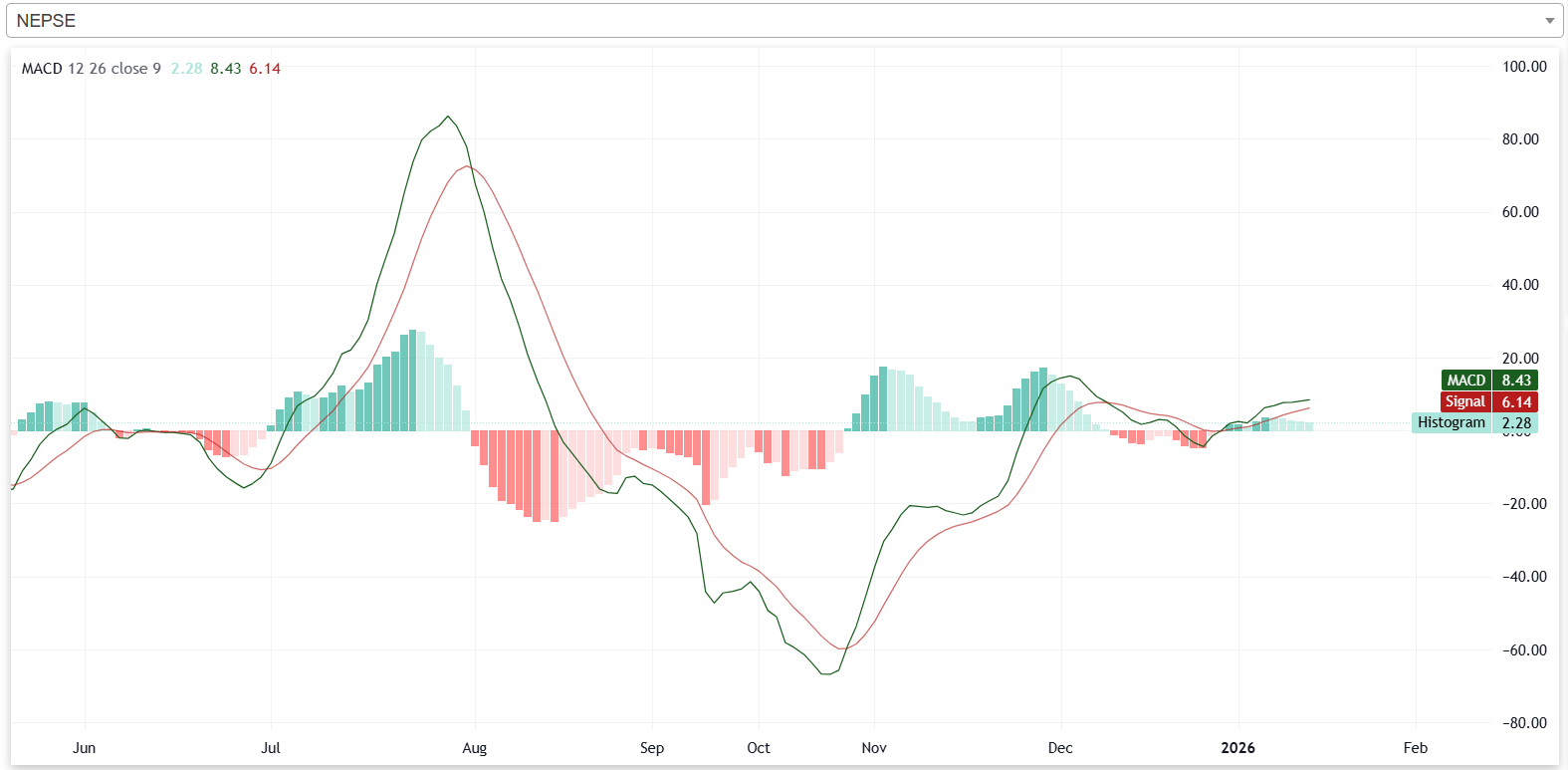 गत साता नेप्सेको एमएसिडी रेखा सिग्नल रेखाभन्दा माथि रहेको छ। त्यस्तै, यी दुबै रेखाहरु र हिस्टोग्राम पनि सकारात्मक क्षेत्रमा रहेका छन्। यसले गत साता नेप्से बुलिश प्रवृत्तिमा रहेको संकेत गर्दछ ।