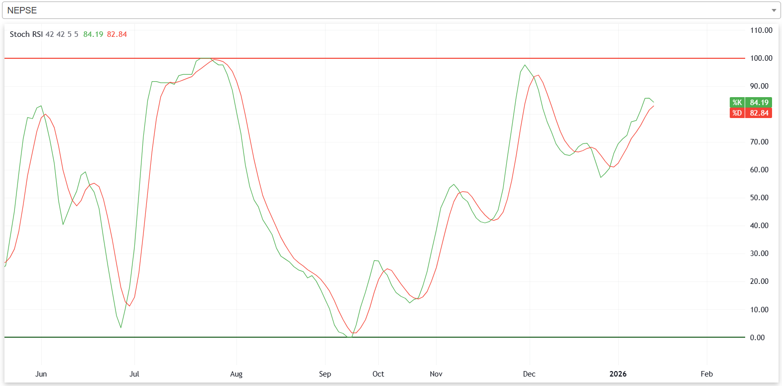 गत साता नेप्सेको स्टकास्टिक आरएसआई न्यूट्रल जोनबाट ओभरबट जोनमा पुगेको छ। यसले गत साता बजारमा बिक्री चापको तुलनामा खरिदचाप बढी रहेको संकेत गर्दछ।