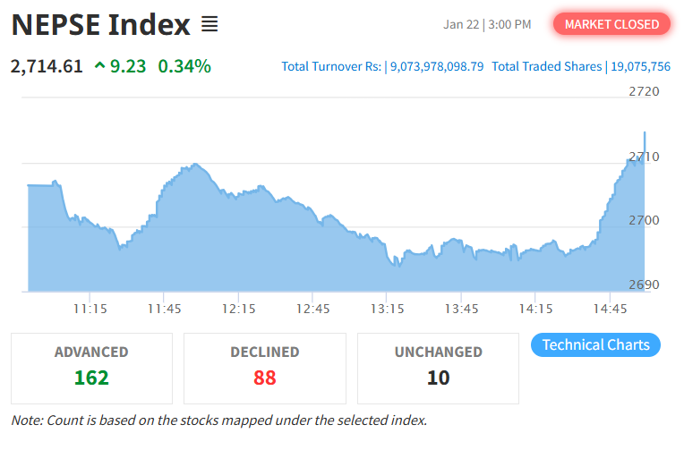बिहीबार नेप्से परिसूचक ९.२३ अंक बढेर २७१४.६१ विन्दुमा पुगेको छ। त्यस्तै, यस दिन फ्लोट इण्डेक्स ०.६६ अंक बढेको छ भने सेन्सेटिभ इण्डेक्स ०.४७ अंक र सेन्सेटिभ फ्लोट इण्डेक्स ०.१४ अंक घटेको छ।