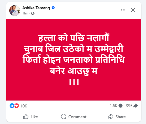 यसअघि पूर्व प्रधानमन्त्री डा. बाबुराम भट्टराईले गोरखा-२ बाट उम्मेदवारी फिर्ता लिएको समाचार सार्वजनिक भए लगत्तै आशिका तामाङको बारेमा पनि त्यस्तै हल्लाहरू चलाइएको थियो। तर, तामाङको पछिल्लो प्रतिक्रियाले उनका समर्थकहरूमा रहेको अन्योल चिरेको छ।
