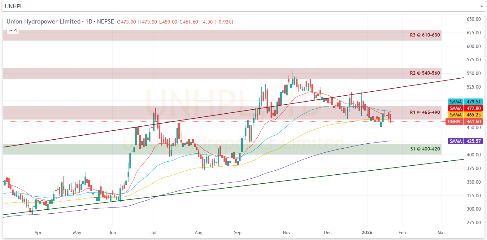 यस साता कम्पनीको शेयरमूल्यले प्रतिरोध परीक्षण गरेको छ। हाल कम्पनीको प्रतिरोध क्षेत्र ४६५ देखि ४९० सम्म रहेको छ। साताको अन्तिम कारोबार दिन कम्पनीको शेयरमूल्यले सो प्रतिरोध क्षेत्र परीक्षण गरी सोभन्दा तल बन्द भएको छ। आगामी दिनमा कम्पनीको शेयरमूल्य सो प्रतिरोध क्षेत्र तोडेर उकालो लागेमा ५४० देखि ५६० को क्षेत्रमा प्रतिरोधको सामना गर्ने देखिन्छ। तर, सो क्षेत्रमा प्रतिरोधको सामना गरी झर्ने क्रमलाई निरन्तरता दिएमा भने ४०० देखि ४२० को क्षेत्रमा टेवा पाउने देखिन्छ।