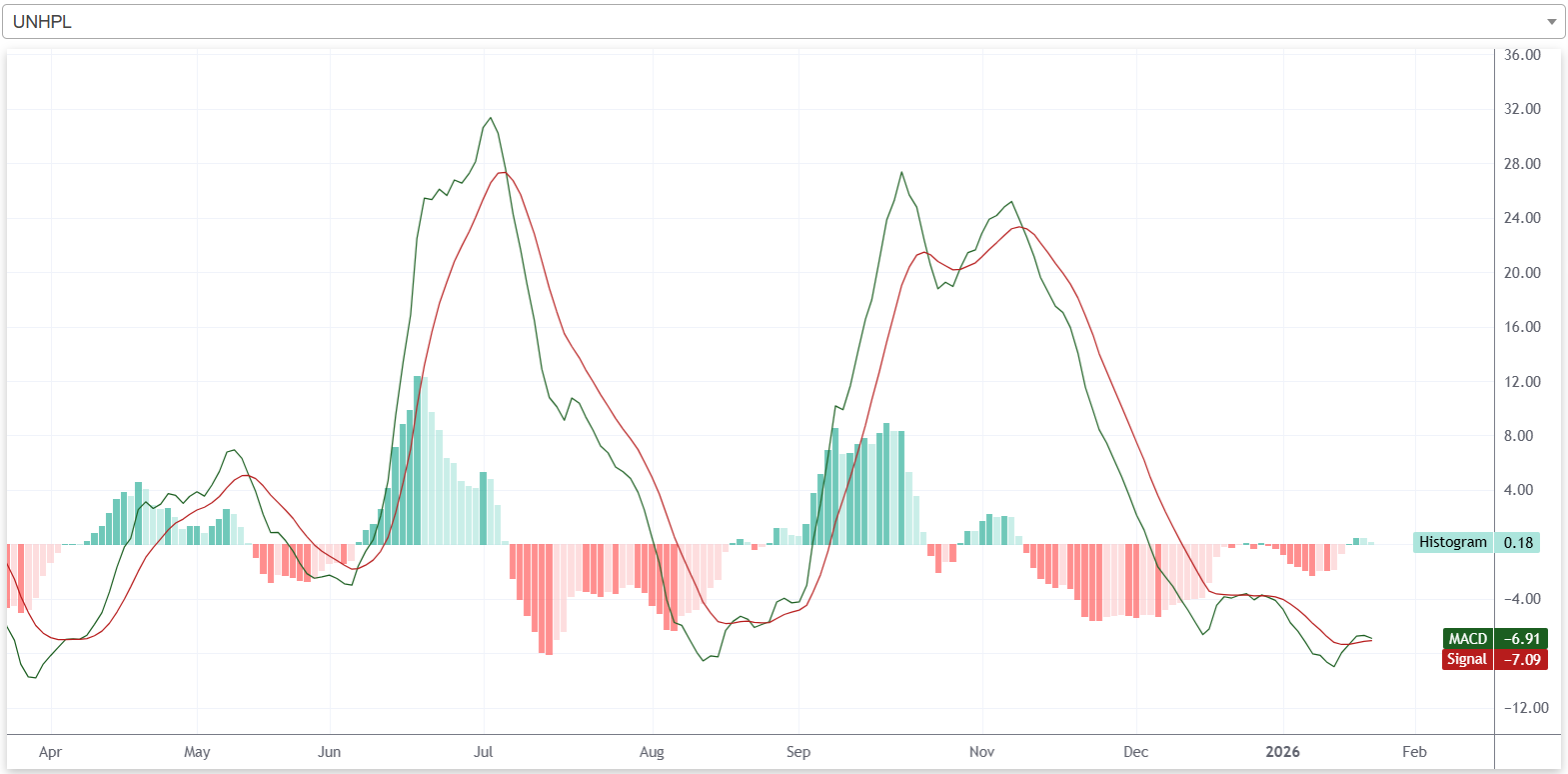 यस साता कम्पनीको शेयरमूल्य बुलिश प्रवृत्तिमा रहेको छ। यस साता कम्पनीको एमएसिडी रेखा, सिग्नल रेखाभन्दा माथि रहेको छ। त्यस्तै, कम्पनीको हिस्टोग्राम पनि सकारात्मक क्षेत्रमा रहेको छ। यद्यपि, साताको अन्तिम कारोबारा दिन एमएसिडी रेखा र सिग्नल रेखाको दूरी घटेको छ। त्यस्तै, हिस्टोग्रामको उचाई पनि घटेको छ। आगामी दिनमा कम्पनीको एमएसिडी रेखाले सिग्नल रेखालाई माथिबाट काटेर तल लागेमा बियरिश क्रशओभर बन्नेछ र त्यसले कम्पनीको शेयरमूल्य घट्ने संकेत गर्दछ।