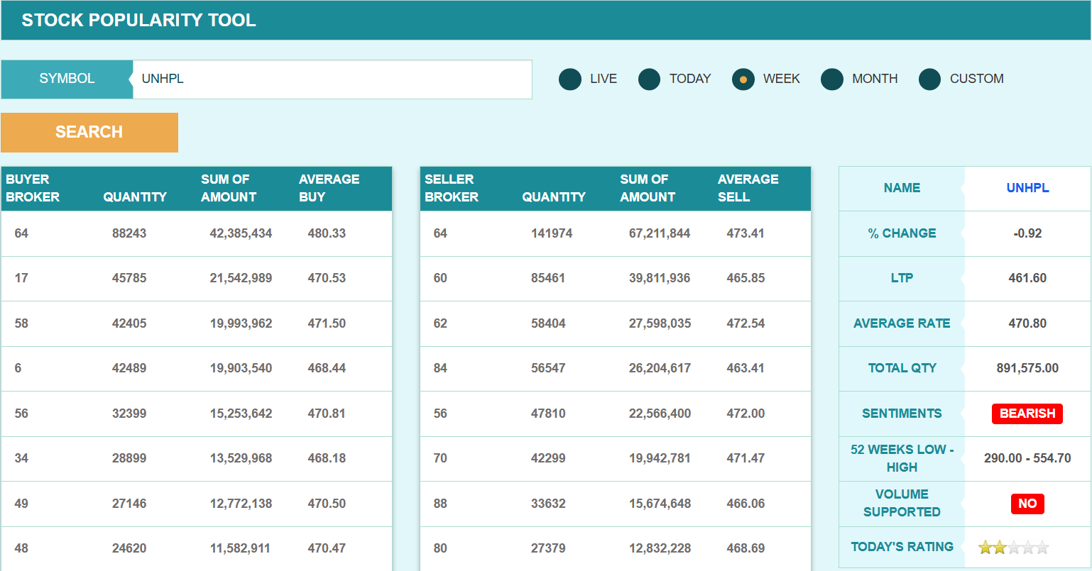 यस साता ब्रोकर नम्बर ६४ ले कम्पनीको सबैभन्दा बढी शेयर खरिद गरेको छ। सो ब्रोकरले यस साता कम्पनीको ८८ हजार २४३ कित्ता शेयर खरिद गरेको हो। त्यस्तै, यस साता ब्रोकर नम्बर १७ ले साढे ४५ हजारभन्दा बढी र ५८ ले कम्पनीको करिब साढे ४२ हजार कित्ता शेयर खरिद गरेको छ। यस साता ब्रोकर नम्बर ६४ ले नै कम्पनीको सबैभन्दा बढी शेयर बिक्री गरेको छ। सो ब्रोकरले यस साता कम्पनीको १ लाख ४१ हजार ९७४ कित्ता शेयर बिक्री गरेको हो।