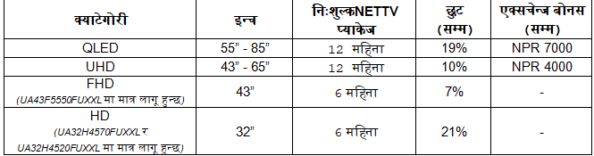 यसका साथै, मनोरन्जनको अनुभवलाई अझ राम्रो बनाउन, सामसङले २०२१ देखि २०२५ सम्म उत्पादन भएका टिभीको खरिद गर्दा आफ्ना ग्राहकहरूलाई रु ३००० सम्मको नि:शुल्क NETTV प्याकेज पनि प्रदान गर्दैछ। QLED र UHD मोडेल किन्दा १२ महिनाको निःशुल्क NETTV सब्स्क्रिप्सन पाइन्छ भने FHD र HD मोडेल किन्दा ६ महिनाको निःशुल्क NETTV सब्स्क्रिप्सन पाइन्छ।