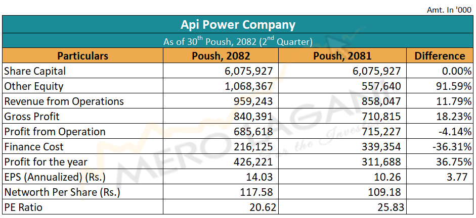 समीक्षा अवधिमा कम्पनीको विद्युत बिक्री आम्दानी ११.७९ प्रतिशत बढेको छ भने कुल नाफा १८.२३ प्रतिशत बढेको छ। समीक्षा अवधिमा कम्पनीको वित्तीय खर्च भने ३६.३१ प्रतिशत घटेको छ।