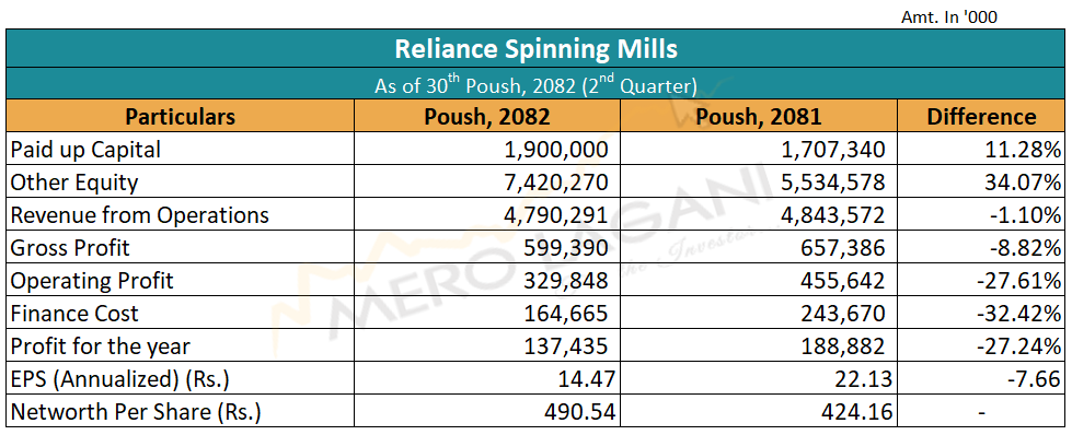 नाफासँगै कम्पनीको प्रतिशेयर आम्दानी पनि घटेको छ। समीक्षा अवधिमा कम्पनीको यस्तो आम्दानी ७ रुपैयाँ ६६ पैसा घटेर १४ रुपैयाँ ४७ पैसामा सीमित भएको छ। दोस्रो त्रैमासको अन्त्यसम्ममा कम्पनीको प्रतिशेयर नेटवर्थ ४९० रुपैयाँ ५४ पैसा रहेको छ।