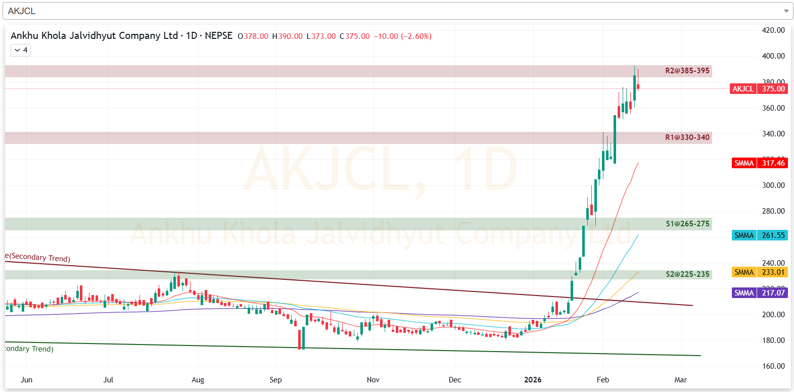 साताको अन्तिम दुई कारोबार दिन कम्पनीको शेयरमूल्य प्रतिरोध परीक्षणमा रहेको देखिन्छ। हाल कम्पनीको प्रतिरोध क्षेत्र ३८५ देखि ३९५ सम्म रहेको छ। साताको अन्तिम कारोबार दिन कम्पनीको शेयरमूल्यले सो क्षेत्र परीक्षण गरी तल झरेको छ। आगामी कारोबार दिनमा कम्पनीको शेयरमूल्य ओरालो लागेमा ३३० देखि ३४० को क्षेत्रमा टेवा पाउने देखिन्छ।