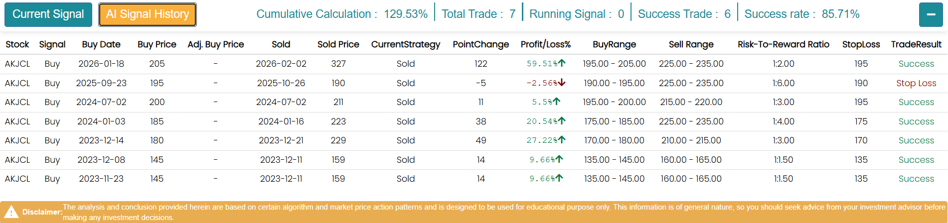 मेरोलगानी चार्टले हालसम्म कम्पनीको शेयरमा ७ पटक बाई सिग्नल दिइसकेको छ। जसमध्ये ६ सिग्नलबाट लगानीकर्ताहरुले नाफा कमाएका थिए भने एक सिग्नलमा स्टप लस गर्नु परेको थियो। हाल मेरोलगानी एआई चार्टले कम्पनीको शेयरमा कुनै सिग्नल दिएको छैन।