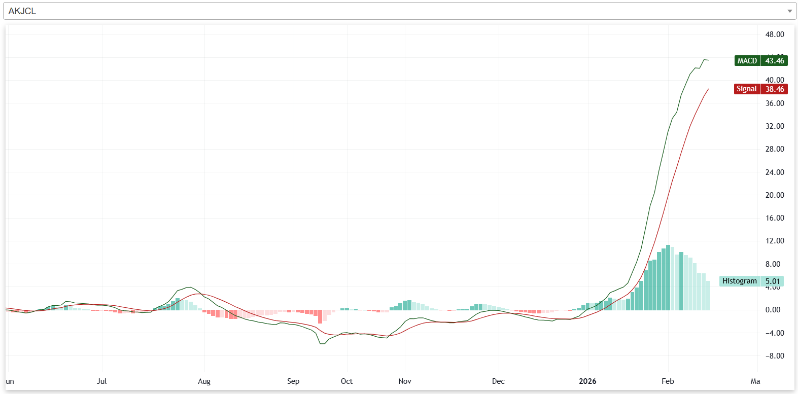यस साता कम्पनीको एमएसिडी रेखा सिग्नल रेखाभन्दा माथि रहेको छ। त्यस्तै, एमएसिडी रेखा, सिग्नल रेखा र हिस्टोग्राम सबै सकारात्मक क्षेत्रमा रहेको छ। यसले यस साता कम्पनीको शेयरमूल्य बुलिश प्रवृत्तिमा रहेको संकेत गर्दछ। यद्यपि, साताको अन्त्यतिर एमएसिडी रेखा र सिग्नल रेखा बीचको दूरी र हिस्टोग्रामको उचाइ घटेको छ।
