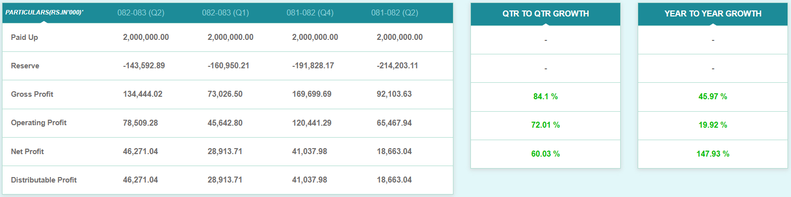 कम्पनीले चालु आर्थिक वर्षको दोस्रो त्रैमाससम्ममा ४ करोड ६२ लाख रुपैयाँ खुद नाफा कमाएको छ। यो गत आर्थिक वर्षको सोही अवधिको तुलनामा १४७.९३ प्रतिशत बढी हो। गत आर्थिक वर्षको सोही अवधिसम्ममा कम्पनीले १ करोड ८६ लाख रुपैयाँ खुद नाफा कमाएको थियो।