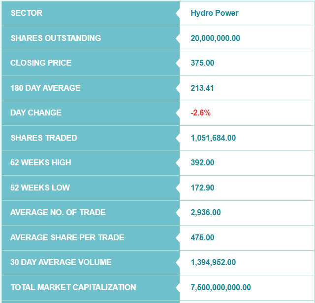 कम्पनीको पछिल्लो ५२ हप्ताको उच्च मूल्य ३९२ रुपैयाँ रहेको छ भने न्यून मूल्य १७२ रुपैयाँ ९० पैसा रहेको छ। कम्पनीको १८० दिने औषत मूल्य २१३ रुपैयाँ ४१ पैसा रहेको छ।