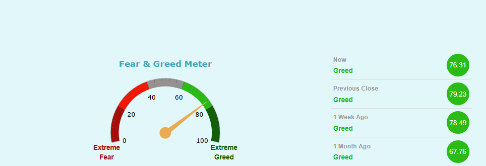 फियर एण्ड ग्रीड मिटरमा कम्पनी अहिले ग्रीड जोनमा छ। यसले लगानीकर्ताहरु कम्पनीको शेयरमूल्य बढ्छ भन्ने अपेक्षामा रहेको संकेत गर्दछ। यद्यपि, यो विस्तारै घट्न थालेको छ।