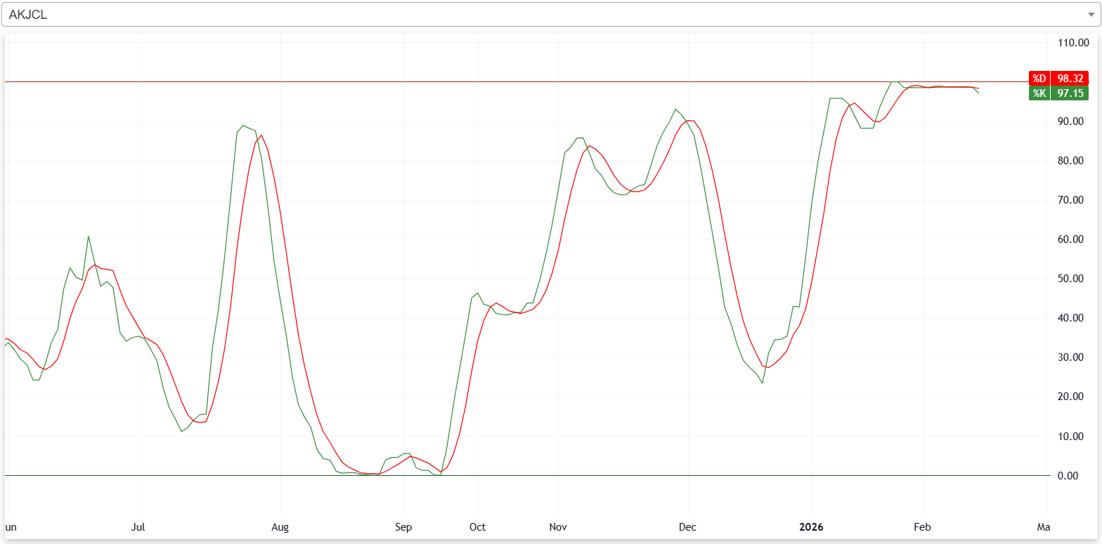 स्टकास्टिक आरएसआई अनुसार कम्पनीको शेयर अहिले ओभरबट जोनमा रहेको छ। यसले बजारमा बिक्रीचापको तुलनामा खरिदचाप बढी रहेको संकेत गर्दछ।