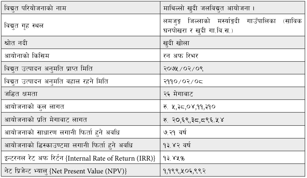 कम्पनीले सञ्चालन गरेको २६ मेगावाट क्षमताको माथिल्लो खुदी जलविद्युत आयोजनाको कुल लागत ५ अर्ब ३८ करोड ४ लाख ११ हजार ३१० रुपैयाँ रहेको छ भने प्रतिमेगावाट लागत २० करोड ६९ लाख ३८ हजार ८९३ रुपैयाँ रहेको छ। सो जलविद्युत आयोजनाको विद्युत अनुमति पत्र २७ वर्ष ५ महिना बाँकी छ। आयोजनाको साधारण लगानी फिर्ता हुने अवधि ७.२१ वर्ष रहेको छ भने डिस्काउण्टमा लगानी फिर्ता हुने अवधि १३.४२ वर्ष रहेको छ।