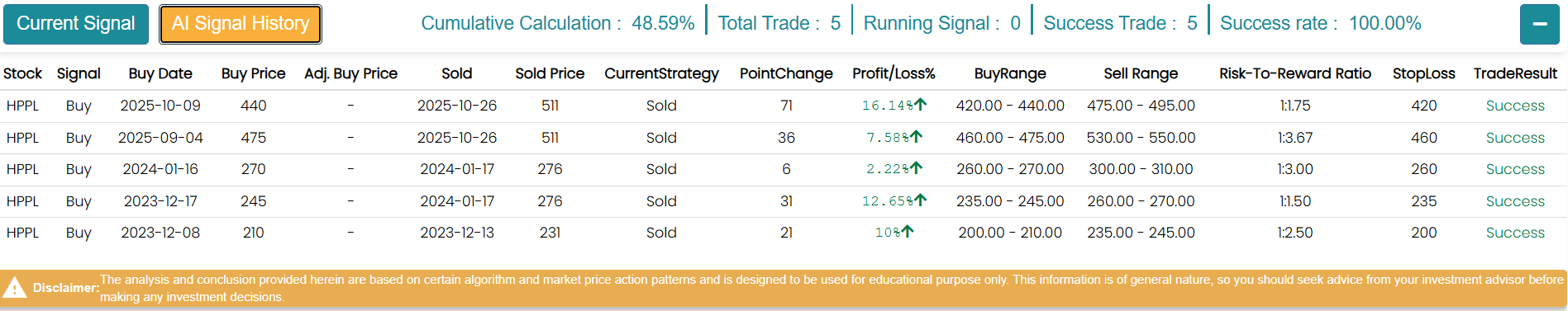 मेरोलगानी एआई चार्टले हालसम्म कम्पनीको शेयरमा ५ पटक बाइ सिग्नल दिइसकेको छ। जसमध्ये ५ वटै सिग्नल सफल भएका थिए। पछिल्लो समय मेरोलगानी एआई चार्टले कम्पनीको शेयरमा कुनै बाइ सिग्नल दिएको छैन।