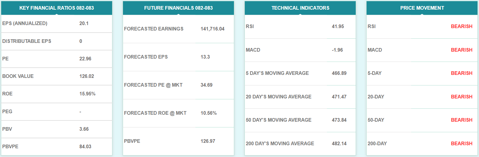 पुस मसान्तसम्ममा कम्पनीको प्रतिशेयर आम्दानी २० रुपैयाँ १० पैसा रहेको छ भने प्रतिशेयर नेटवर्थ १२६ रुपैयाँ २ पैसा रहेको छ। यस साताको अन्तिम कारोबार मूल्य आधारमा कम्पनीको मूल्य आम्दानी अनुपात २२.९६ गुणा रहेको छ भने प्राइस टु बुकभ्यालु रेशियो ३.६६ गुणा रहेको छ।