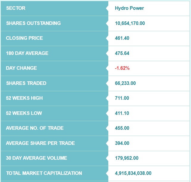 हाल नेप्सेमा कम्पनीको १ करोड ६ लाख ५४ हजार १७० कित्ता शेयर सूचीकृत छ। साताको अन्तिम कारोबार मूल्यका आधारमा कम्पनीको कुल बजार पूँजीकरण ४ अर्ब ९१ करोड ५८ लाख ३४ हजार ३८ रुपैयाँ रहेको छ। कम्पनीको १८० दिने औषत मूल्य ४७५ रुपैयाँ ६४ पैसा रहेको छ। त्यसैगरी, कम्पनीको ५२ हप्ताको उच्च मूल्य ७११ रुपैयाँ रहेको छ भने न्यून मूल्य ४११ रुपैयाँ १० पैसा रहेको छ।