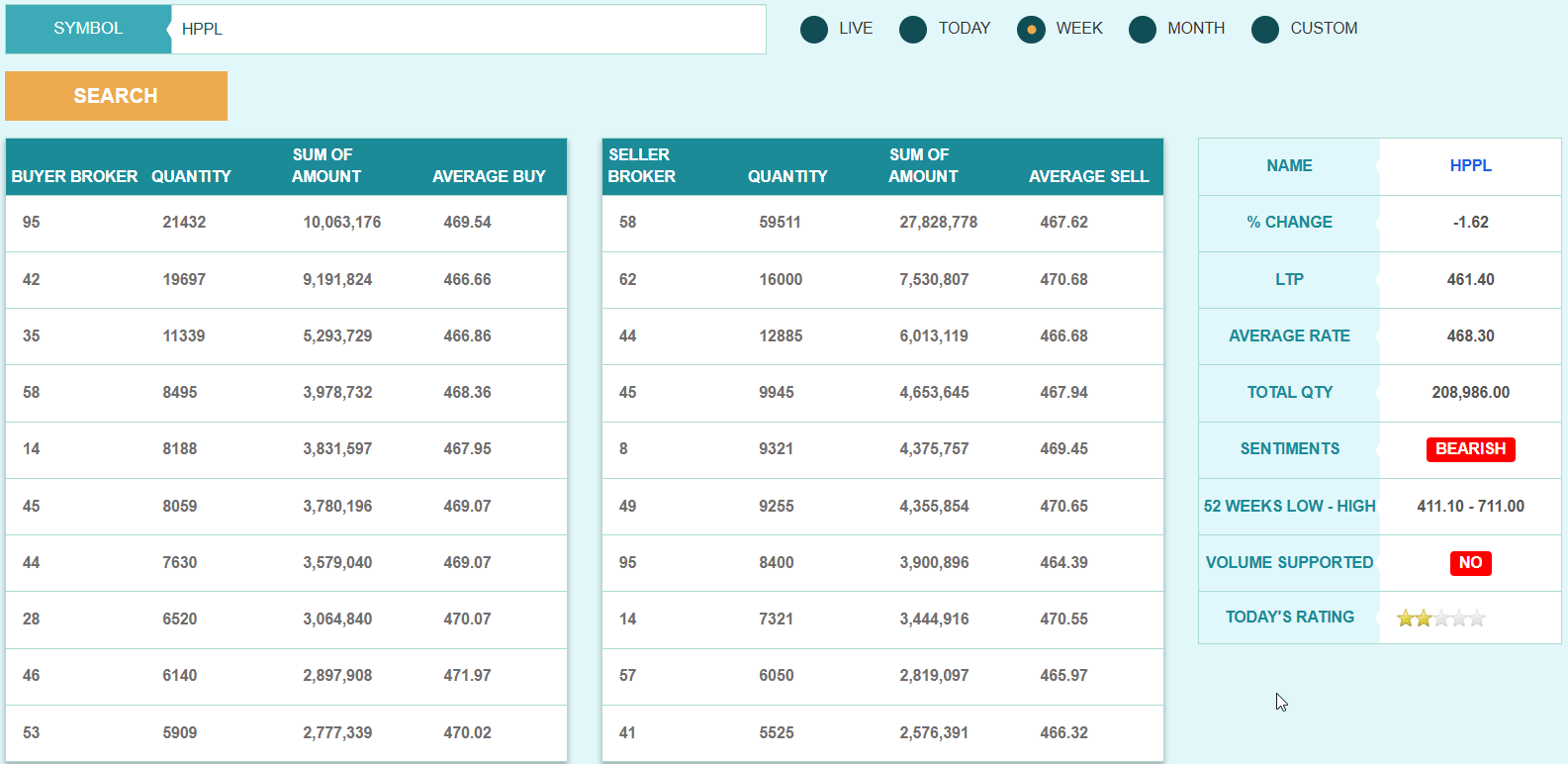 यस साता ब्रोकर नम्बर ९५ ले कम्पनीको सबैभन्दा बढी शेयर खरिद गरेको छ। सो ब्रोकरले यस साता कम्पनीको २१ हजार ४३२ कित्ता शेयर खरिद गरेको हो। त्यस्तै, यस साता ब्रोकर नम्बर ४२ ले साढे १९ हजारभन्दा बढी र ३५ ले कम्पनीको ११ हजारभन्दा बढी कित्ता शेयर खरिद गरेको छ। यस साता ब्रोकर नम्बर ५८ ले कम्पनीको सबैभन्दा बढी शेयर बिक्री गरेको छ। सो ब्रोकरले यस साता कम्पनीको ५९ हजार ५११ कित्ता शेयर बिक्री गरेको हो।
