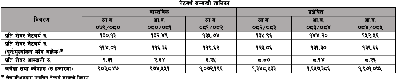चालु आर्थिक वर्षको अन्त्यसम्ममा कम्पनी जगेडा कोषमा १ अर्ब ३४ करोड ८५ लाख ३३ हजार रुपैयाँ रहने प्रक्षेपण गरिएको छ। सो अवधिसम्ममा कम्पनीको प्रतिशेयर आम्दानी ८ रुपैयाँ ८० पैसा र प्रतिशेयर नेटवर्थ १३५ रुपैयाँ ९६ पैसा पुग्ने प्रक्षेपण गरिएको छ।
