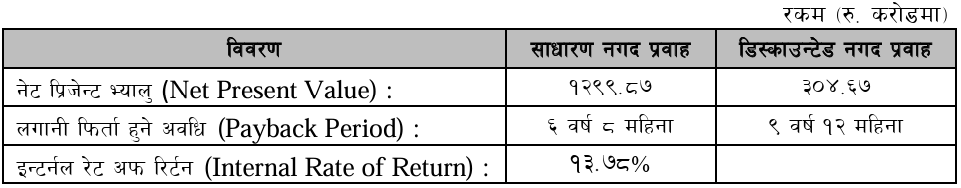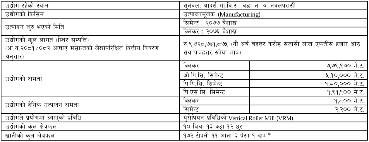 कम्पनीको नेट प्रिजेन्ट भ्यालु १२ अर्ब ९९ करोड ८७ लाख रुपैयाँरहेको छ भने इन्टरनल रेट अफ रिटर्न १३.७८५ रहेको छ। कम्पनीको साधारण लगानी फिर्ता हुने अवधि ६ वर्ष ८ महिना रहेको छ भने डिस्काउण्टमा लगानी फिर्ता हुने अवधि १० वर्ष रहेको छ। कम्पनीको उद्योगको कुल क्षेत्रफल १० बिघा १३ कठ्ठा १२ धुर र खानीको कुल क्षेत्रफल १७२ रोपनी ११ आना ३ पैसा १ दाम रहेको छ। कम्पनीले २०७६ बैशाखदेखि क्लिंकर र २०७७ बैशाखदेखि सिमेन्ट उत्पादन गरिरहको छ। कम्पनीको दैनिक क्लिंकर उत्पादन क्षमता १ हजार ८०० मेट्रिक टन र सिमेन्ट उत्पादन क्षमता १ हजार २०० मेट्रिक टन रहेको छ।