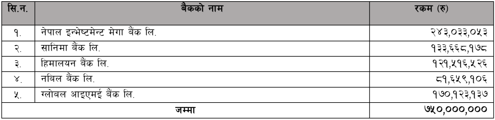 कम्पनीले आईपीओ निष्काशनबाट संकलन गरेको रकममध्ये २४ करोड ३० लाख ३३ हजार ५३ रुपैयाँ नेपाल इन्भेष्टमेन्ट मेगा बैंकमा कर्जा भुक्तानी गर्न प्रयोग गर्नेछ भने १३ करोड ३६ लाख ६८ हजार १७८ रुपैयाँ सानिमा बैंकको कर्जा भुक्तानी गर्न र १२ करोड १५ लाख १६ हजार ५२६ रुपयाँ हिमालयन बैंकको कर्जा भुक्तानी गर्न प्रयोग गर्नेछ। त्यस्तै, कम्पनीले ८ करोड १६ लाख ५९ हजार १०६ रुपैयाँ नबिल बैंकका कर्जा तिर्न र १७ करोड १ लाख २३ हजार १३७ रुपैयाँ ग्लोबल आइएमई बैंकबाट लिएको ऋण तिर्न प्रयोग गर्नेछ।