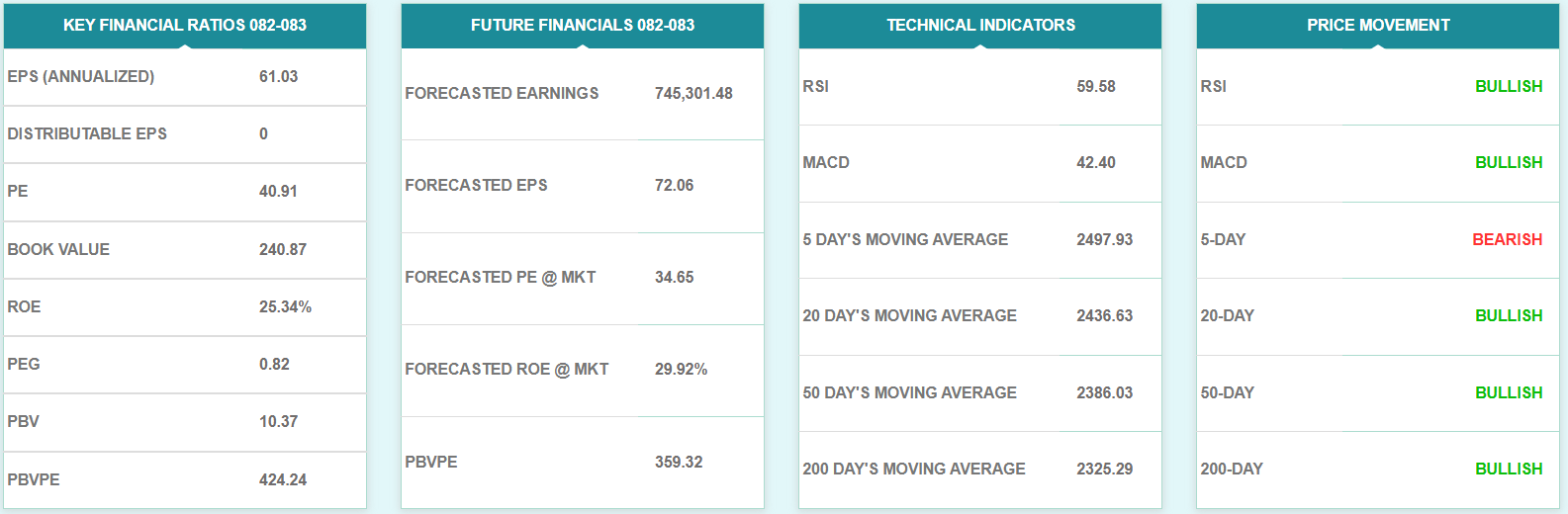चालु आर्थिक वर्षको पहिलो ६ महिनासम्ममा कम्पनीको प्रतिशेयर आम्दानी ६१ रुपैयाँ ३ पैसा रहेको छ भने बुकभ्यालु २४० रुपैयाँ ८७ पैसा रहेको छ। यस साताको अन्तिम कारोबार मूल्य आधारमा कम्पनीको मूल्य आम्दानी अनुपात ४०.९१ गुणा रहेको छ भने प्राइस टु बुकभ्यालु रेशियो १०.३७ गुणा रहेको छ।