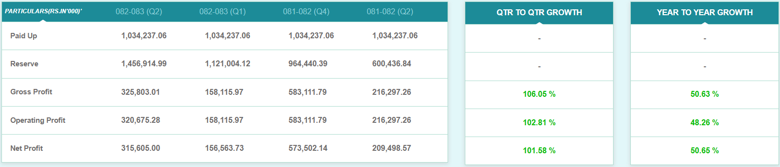 समीक्षा अवधिमा कम्पनीको कुल नाफा ५०.६३ प्रतिशत बढेको छ भने सञ्चालन मुनाफा ४८.२६ प्रतिशत बढेको छ। गत आर्थिक वर्षको दोस्रो त्रैमाससम्ममा ४० करोड ८१ लाख रुपैयाँ रहेको कम्पनीको वित्तीय खर्च, चालु आर्थिक वर्षको सोही अवधिसम्ममा भने शून्य रहेको छ।