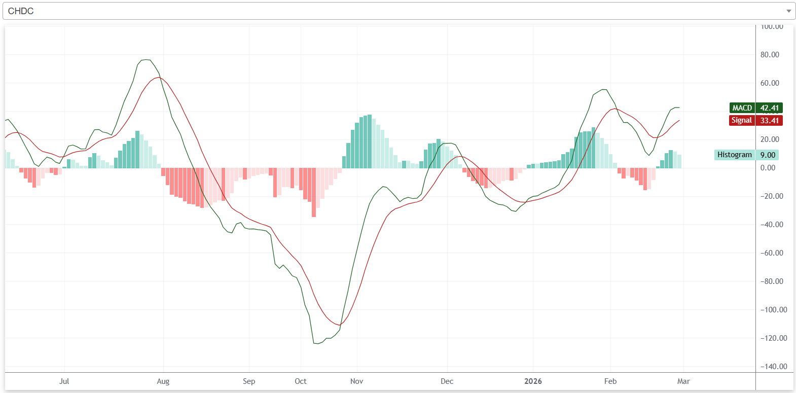 यस साता कम्पनीको शेयरमूल्य बुलिश प्रवृत्तिमा रहेको छ। कम्पनीको एमएसिडी रेखा सिग्नल रेखाभन्दा माथि रहेको छ। त्यसैगरी, कम्पनीको हिस्टोग्राम पनि शून्य रेखाभन्दा माथि रहेको छ। यद्यपि, एमएसिडी रेखा र सिग्नल रेखा बीचको दूरी र हिस्टोग्रामको उचाई घट्दै गएको छ। आगामी दिनमा एमएसिडी रेखाले सिग्नल रेखालाई माथिबाट काटेर तल लागेमा बियरिश क्रशओभर बन्नेछ। जसले कम्पनीको शेयरमूल्य घट्ने संकेत गर्दछ।