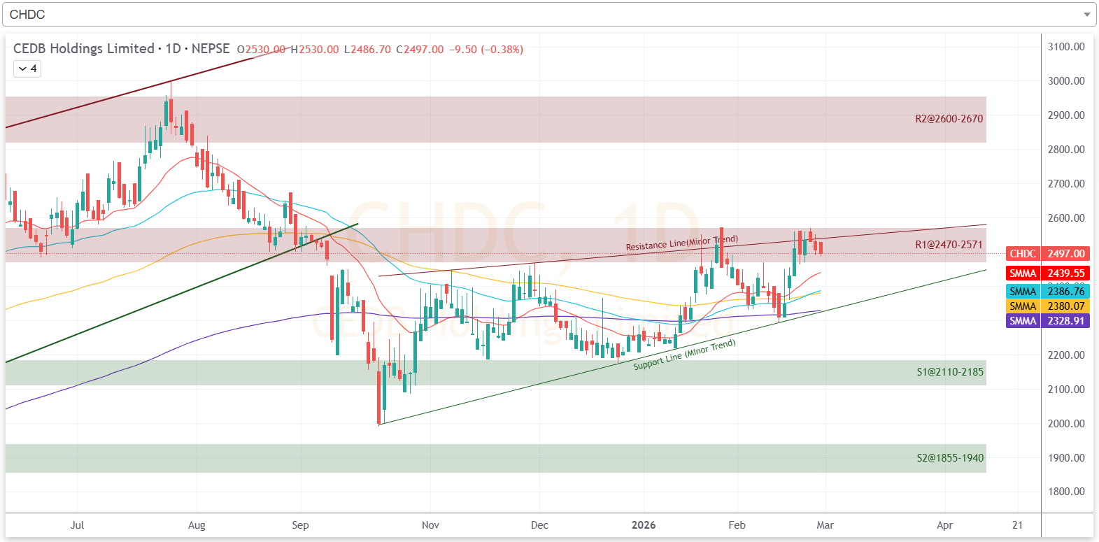 हाल कम्पनीको शेयरमूल्यले २ हजार ४७० देखि २ हजार ५७१ सम्मको प्रतिरोध क्षेत्र परीक्षण गरिरहेको छ। गत साता बढेर सो क्षेत्रमा पुगेको कम्पनीको शेयरमूल्य, यस साताभरी नै सोही क्षेत्रमा रहेको छ। आगामी साता कम्पनीको शेयरमूल्य सो प्रतिरोध क्षेत्र परीक्षण गरेर ओरालो लागेमा २ हजार ११० देखि २ हजार १८५ को क्षेत्रमा टेवा पाउने देखिन्छ।