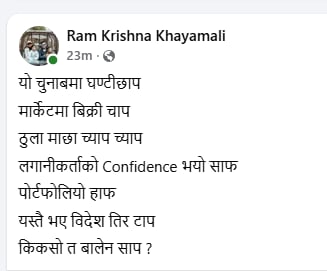 गत मंगलबार २९६०.४० अंकको उच्च विन्दुमा पुगेको नेप्से सूचक बुधबार सम्म आइपुग्दा २७७६.३६ अंकमा ओर्लिएको छ। एक हप्ताको अवधिमा बजार करिब १८४ अंकले घटिसकेको छ। बजारमा दैनिक अर्बौँ रुपैयाँको सम्पत्ति क्षयीकरण भइरहेको छ। तर सरकारले अहिलेसम्म लगानीकर्तालाई सम्बोधन गरेको छैन। यसले गर्दा नयाँ सरकार प्रति लगानीकर्ताको आक्रोश चुलिएको छ। एक लगानीकर्ताले सामाजिक सञ्जालमा व्यङ्ग्य गर्दै लेखेका छन्, 'चुपचाप घण्टी छाप, लगानीकर्ताको पोर्टफोलियो हाफ।' यसैगरी अर्का लगानीकर्ता रामकृष्ण खायमालिले फेस बुकमा यस्तो स्ट्याटस लेखेका छन्।