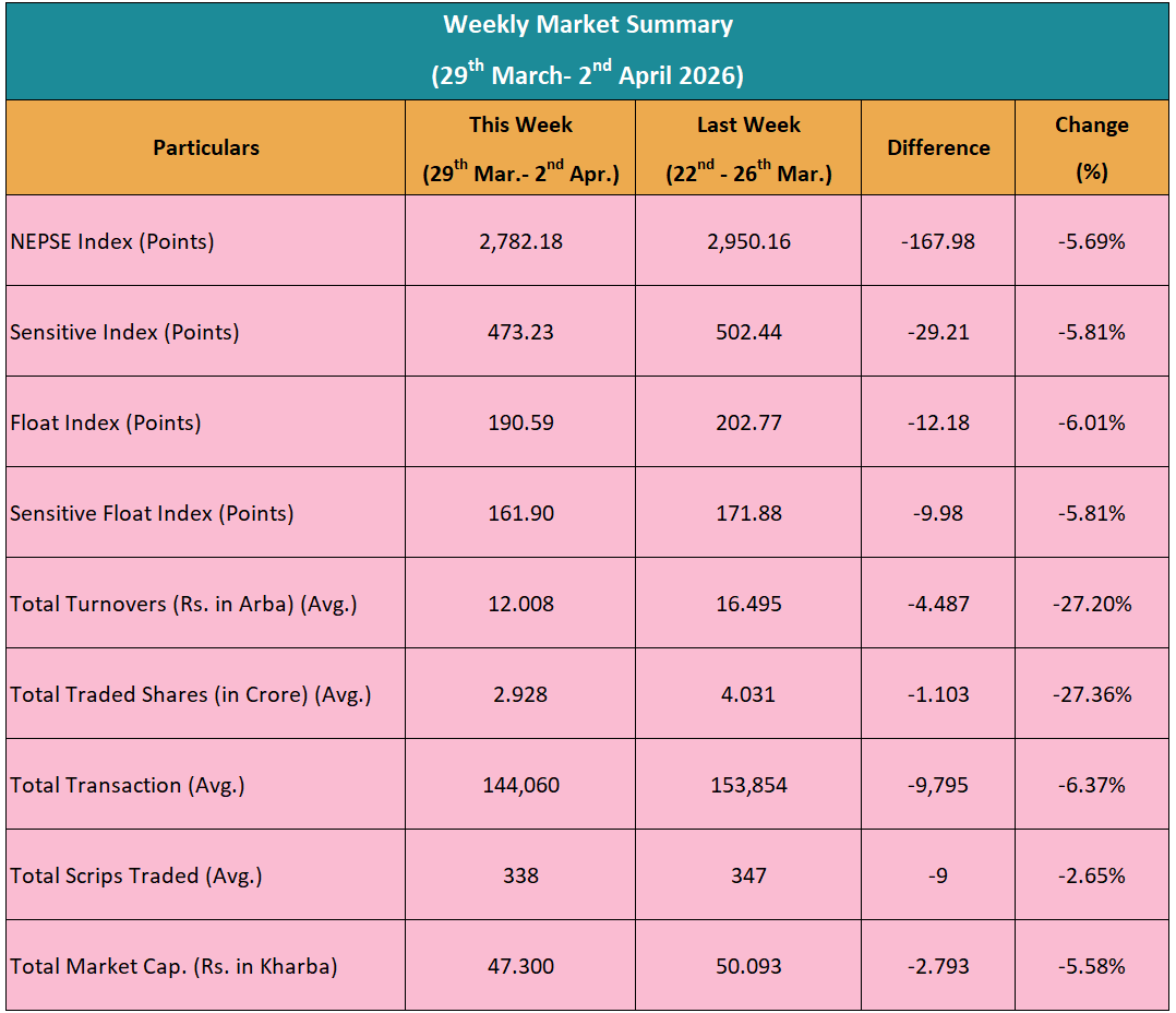 यस साता ५ कारोबार दिनका लागि बजार खुलेको थियो। जसमध्ये ३ कारोबार दिन नेप्से बढेको थियो भने २ कारोबार दिन घटेको थियो।