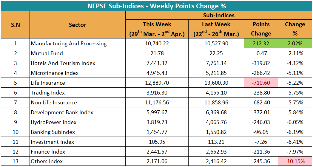 यस साता १३ उपसमूहमध्ये १ उपसमूहको परिसूचक बढेको छ भने १२ उपसमूहको परिसूचक घटेको छ। यस साता उत्पादन तथा प्रशोधन उपसमूहको परिसूचक २.०२ प्रतिशत बढेको छ। गत साता १० हजार ५२७.९० विन्दुमा बन्द भएको यस उपसमूहको परिसूचक, यस साता २१२.३२ अंक बढेर १० हजार ७४० विन्दुमा पुगेको छ।