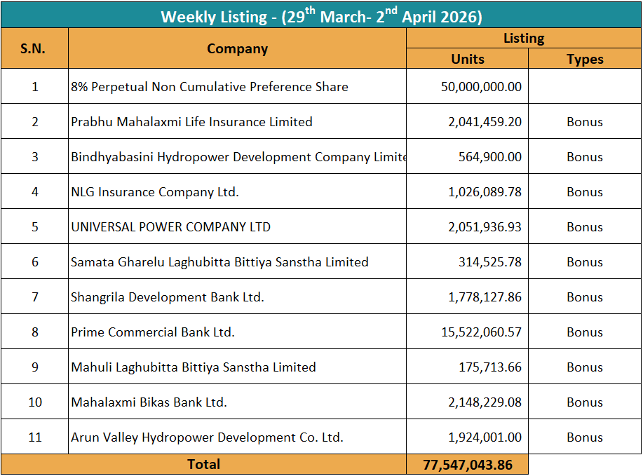 यस साता ११ कम्पनीको ७ करोड ७५ लाख ४७ हजार ४३.८६ कित्ता नेप्सेमा सूचीकृत भएको छ। यस साता नबिल बैंकको ८ प्रतिशत अविमोच्य असञ्चिति अग्राधिकार शेयर नेप्सेमा सूचीकृत भएको हो भने प्रभु महालक्ष्मी लाइफ इन्स्योरेन्स, विन्ध्यबासिनी हाइड्रोपावर डेभलपमेन्ट कम्पनी, एनएलजी इन्स्योरेन्स कम्पनी, युनिभर्सल पावर कम्पनी, समता घरेलु लघुवित्त वित्तीय संस्था, सांग्रीला डेभलपमेन्ट बैंक, प्राइम कमर्सियल बैंक, महुली लघुवित्त वित्तीय संस्था, महालक्ष्मी विकास बैंक र अरुण भ्याली हाइड्रोपावरको बोनस शेयर नेप्सेमा सूचीकृत भएको हो।