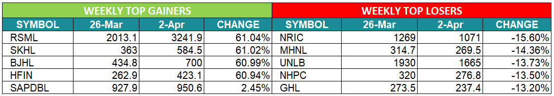 यस साता रिलायन्स स्पिनिङ्ग मिल्सको शेयरमूल्य सर्वाधिक ६१.०४ प्रतिशत बढेको छ। गत साता २ हजार १३ रुपैयाँ १० पैसामा अन्तिम कारोबार भएको सो कम्पनीको शेयर यस साता ३ हजार २४१ रुपैयाँ ९० पैसामा अन्तिम कारोबार भएको छ। त्यस्तै, यस साता सुपर खुदी हाइड्रोपावरको शेयरमूल्य ६१ प्रतिशत बढेको छ भने भुजुङ्ग हाइड्रोपावर र होटल फरेष्ट इनको शेयरमूल्य करिब ६१ प्रतिशत बढेको छ। यस साता नेपाल पुनर्बीमा कम्पनीको शेयरमूल्य सर्वाधिक १५.६० प्रतिशत घटेको छ भने माउन्टेन हाइड्रो नेपालको शेयरमूल्य करिब साढे १४ प्रतिशत घटेको छ।