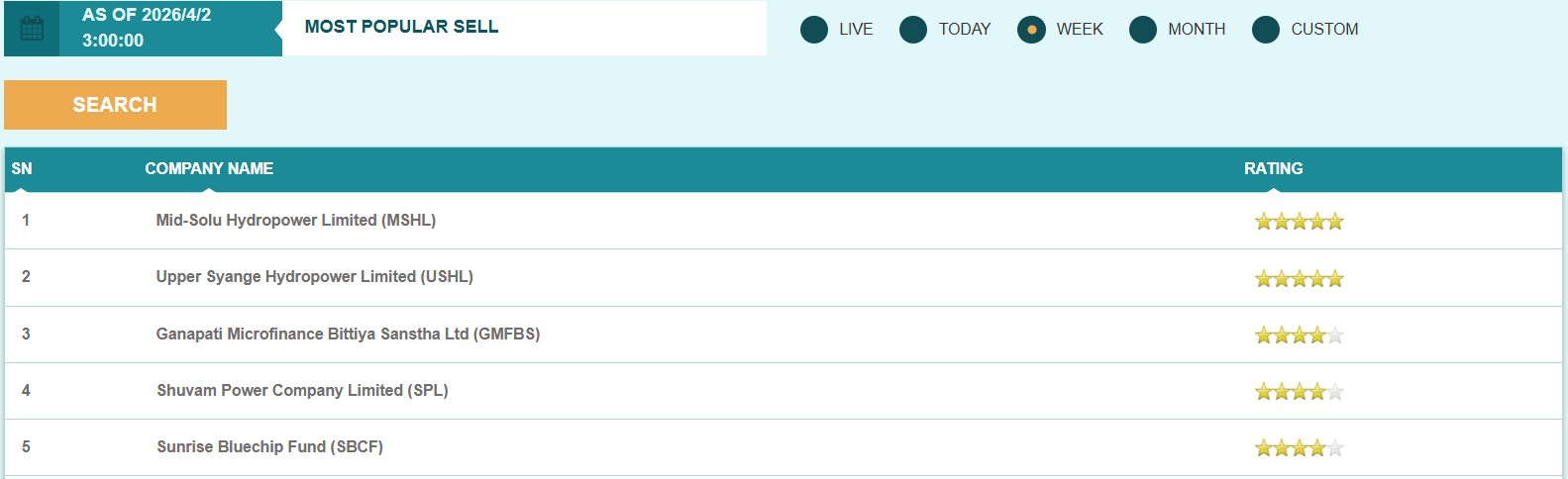 फ्लोरसिट विश्लेषण गर्दा यस साता भुजुङ्ग हाइड्रोपावर, सुपर खुदी हाइड्रोपावर, होटल फरेष्ट इन लगायतका स्टकहरु मोस्ट पपुलर बाइ स्टक सूचीको शीर्ष स्थानमा रहेका छन् भने मिड सोलु हाइड्रोपावर, अप्पर साङ्गे हाइड्रोपावर, गणपति माइक्रोफाइनान्स वित्तीय संस्था लगायतका स्टकहरु मोस्ट पपुलर सेल स्टक सूचीको शीर्ष स्थानमा रहेका छन्।
