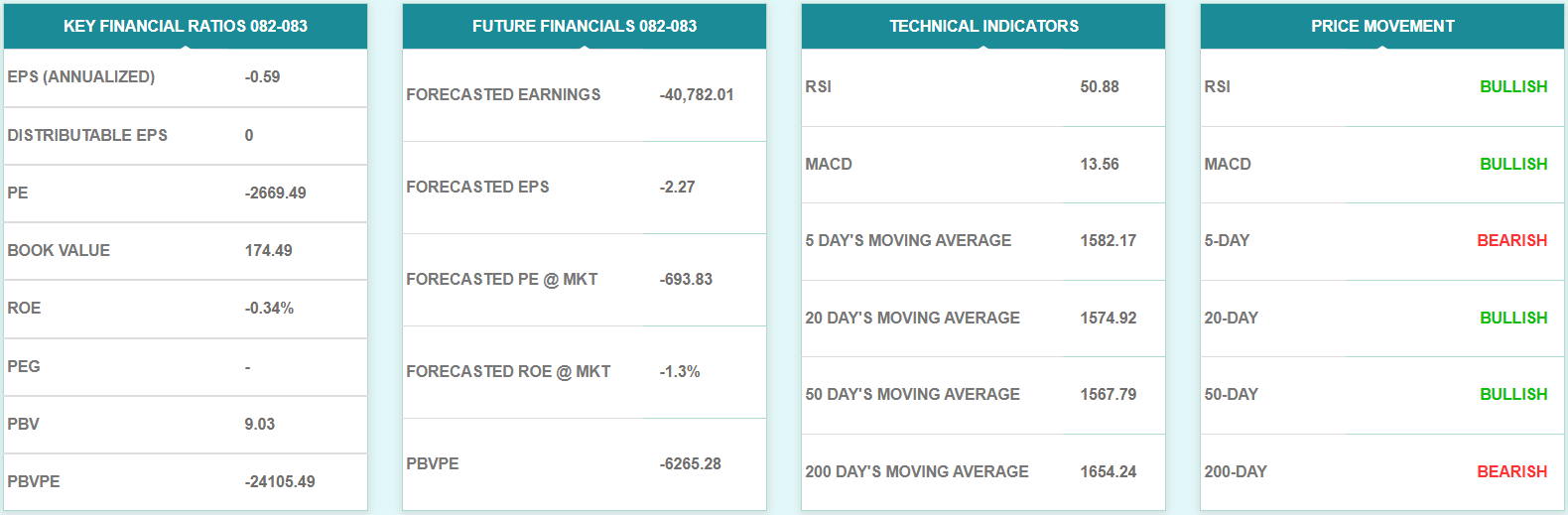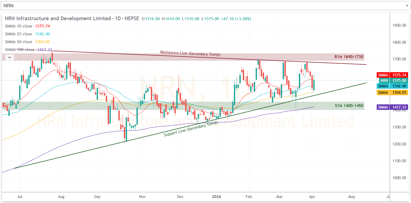 साप्ताहिक रुपमा यस साता कम्पनीको शेयरमूल्यले बियरिश मैनबत्ती बनाएको छ। यसले यस साता कम्पनीको शेयरमा बिक्रीकर्ता हाबी रहेको संकेत गर्दछ। यद्यपि, साताको अन्तिम कारोबार दिन भने कम्पनीको शेयरमूल्यले लामो टुप्पी भएको हरियो मैनबत्ती बनाएको छ जसले सो दिन भने कम्पनीको शेयरमा खरिदकर्ता बलियो रहेको संकेत गर्दछ। आगामी दिनमा कम्पनीको शेयरमूल्य उकालो लागेमा १६९० देखि १७३५ को क्षेत्रमा प्रतिरोधको सामना गर्ने देखिन्छ। भने ओरालो लागेमा १४०० देखि १४५० को क्षेत्रमा टेवा पाउने देखिन्छ।