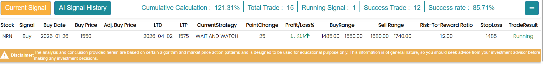 मेरो लगानी एआईले अघिल्लो बिहीबार (मार्च २६) मा कम्पनीको शेयरमा बाई सिग्नल दिएको थियो। एआईले १४८५ देखि १५५० मा बाइ सिग्नल दिएको थियो। जसअनुसार १५५० मा शेयर खरिद गरेका लगानीकर्ताहरु यस साताको अन्त्यसम्ममा १.६१ प्रतिशत नाफामा रहेका छन्। मेरोलगानी एआई अनुसार सो सिग्नलको सेलिङ्ग रेञ्ज १६८० देखि १७४० भित्र रहेको छ भने स्टप लस १४८५ रहेको छ।