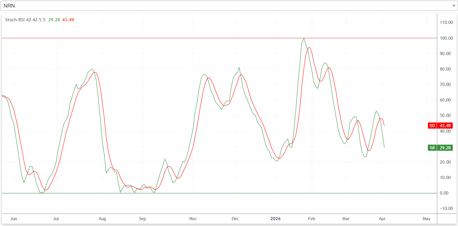 साताको अन्तिम कारोबार दिन स्टकास्टिक आरएसआईमा कम्पनीको शेयरमूल्य न्यूट्रल जोनबाट ओभरसोल्ड जोनतर्फ झर्दै गरेको देख्न सकिन्छ। यसले सो साता कम्पनीको शेयरमा बिक्रीचाप बढ्न थालेको संकेत गर्दछ।