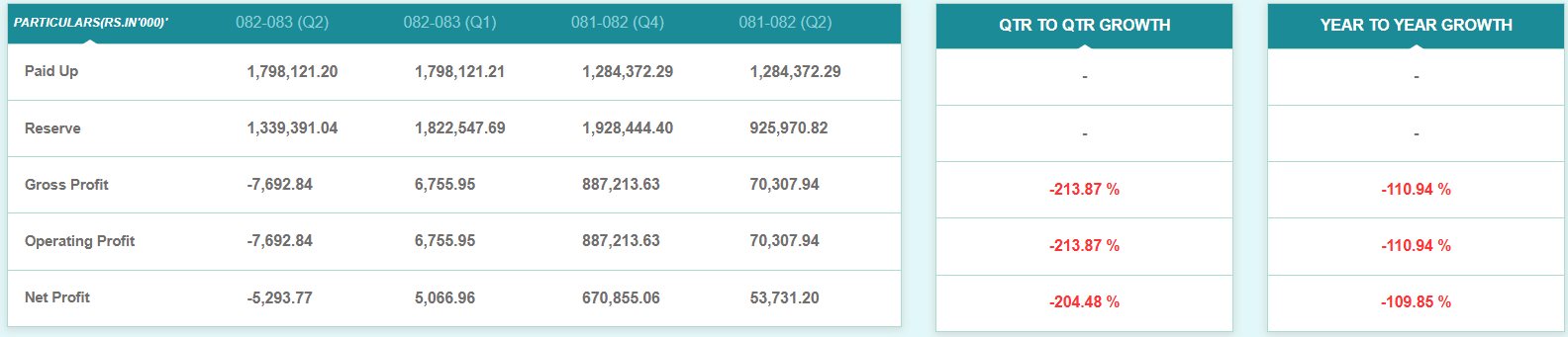 चालु आर्थिक वर्षको पुस मसान्तसम्ममा कम्पनी ५२ लाख ९३ हजार नोक्सानीमा रहेको छ। गत आर्थिक वर्षको सोही अवधिसम्ममा कम्पनी ५ करोड ३७ लाख रुपैयाँ नाफामा थियो।
